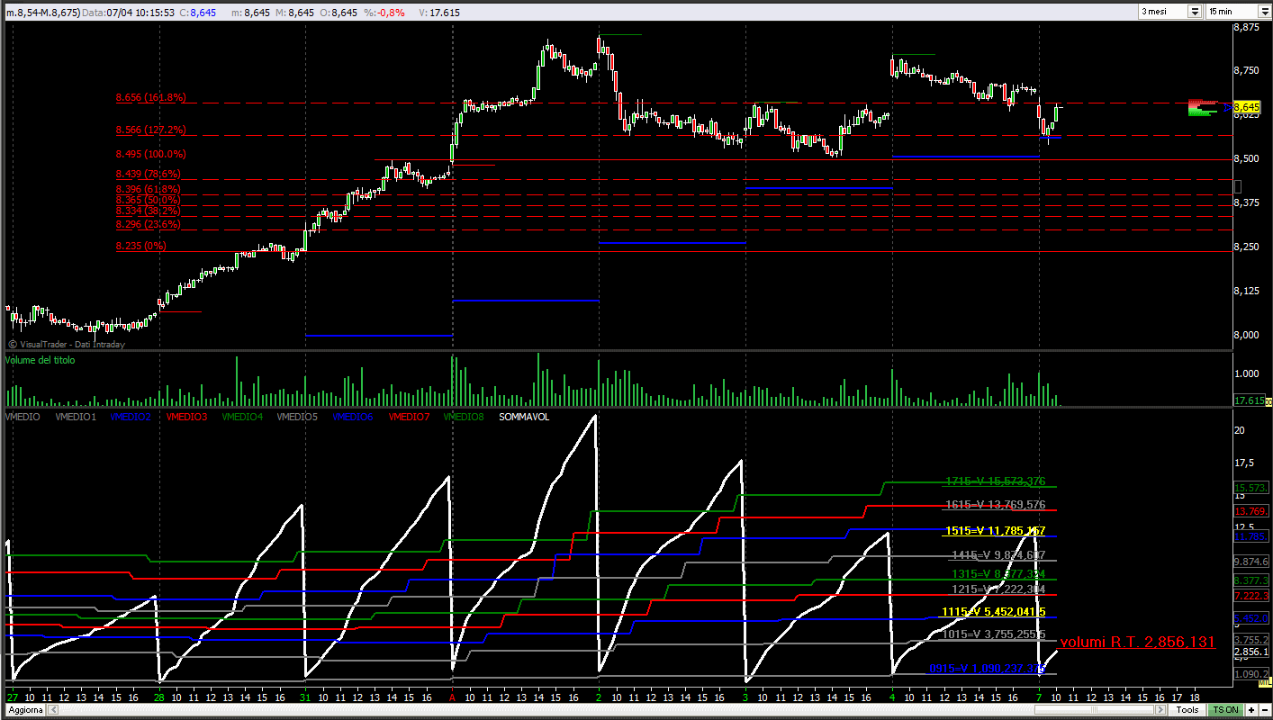 come movimenti speculativi sul veloce abbiamo quello short del 24 aprile concluso in target finale ( 423.6%)...ora da ieri è in atto un long ma con volumi inferiori a quello precedente...un close sul 15 minuti inferiore a 8.62€ lo annulla